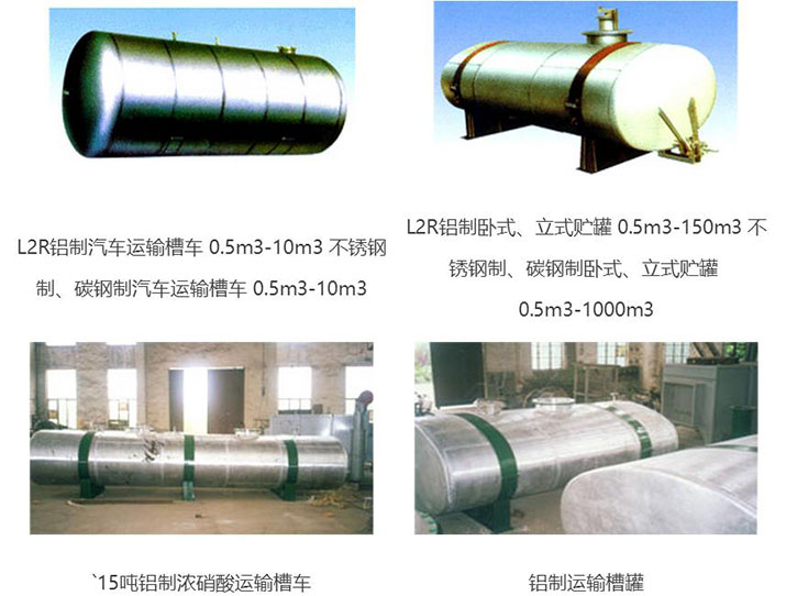 工業(yè)純鋁板制汽車運輸槽車、臥式、立式貯罐、高位槽。(主要用于貯運 濃硝酸、冰醋酸等腐蝕液體)不銹鋼、碳鋼制各種汽車運輸槽車,臥式、 立式貯槽,高位槽計量槽。特殊規(guī)格可按用戶需求設計、制造。