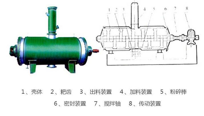 具有結構簡單,操作方便,使用周期長,性能穩定可靠,蒸汽耗量小,適用性能強,產品質量好,特別適用于不耐高溫、易燃、調溫下易氧化的膏狀物料的干燥,該機經用戶長期使用證明是一良好的干燥設備。原理:被干燥物料從殼體上方正中間加入,在不斷正反轉動的耙齒的攪拌下,物料軸向來回走動,與殼體內壁接觸的表面不斷更新,受到蒸汽的間接加熱,耙齒的均勻攪拌,粉碎棒的粉碎,使物料表面水分更有利的排出,氣化的水分經干式除塵器、濕式除塵器、冷凝器,從真空泵出口處放空。結構:真空耙式干燥機的主要部件